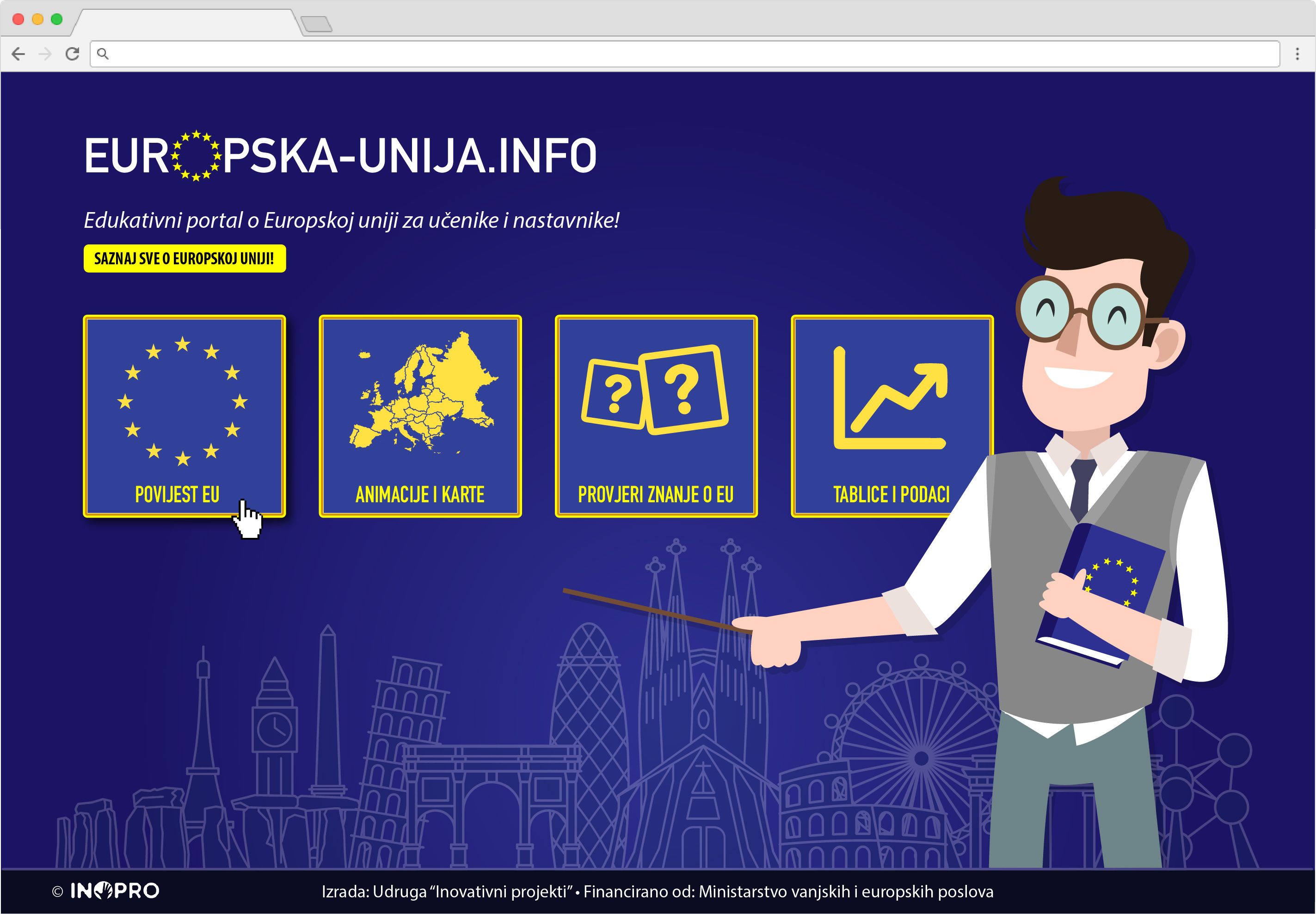 Nepostojanje sustavnog izučavanja o europskim temama u hrvatskim školama, s tek jednom nastavnom jedinicom u kurikulumu geografije i povijesti, zaista je porazna činjenica. Hrvatska je već punih pet godina punopravna članica nakon desetogodišnjeg izazovnog procesa pridruživanja, a kako se radi o najsnažnijem gospodarstvu svijeta koje i Hrvatskoj otvara brojna vrata putem svojih strukturnih i investicijskih fondova, mišljenja smo da putem internetskog edukativnog portala koji bi sadržavao sve relevantne informacije, kvizove, nastavne pripreme i teme za nastavnike te zabavne animacije i grafičke priloge, možemo dati svoj obol boljem poznavanju europskih tema i mjesta koje Hrvatska zauzima u europskom prostoru.